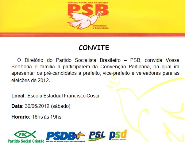 16h às 19h, na Escola Estadual Francisco Costa. PSB, PSC, PSD, PSL e